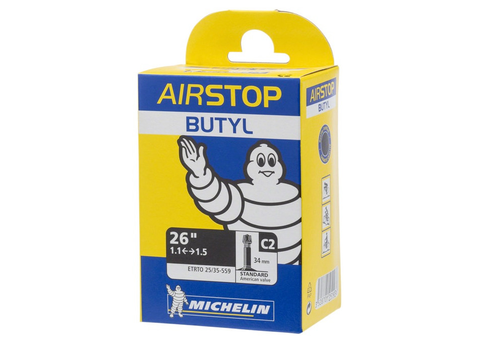 Ο Αεροθάλαμος Ποδηλάτου Michelin 26x1.1/1.5 Airstop C2 34mm A/V με βαλβίδα αυτοκινήτου (Schrader) είναι η τέλεια επιλογή για ποδηλάτες που αναζητούν έναν ευέλικτο και αξιόπιστο αεροθάλαμο για τα ποδήλατα τους. Σχεδιασμένος για τροχούς διαμέτρου 26" και ελαστικά με εύρος 1.1" έως 1.5", είναι ιδανικός για ποδήλατα δρόμου, ποδήλατα βουνού, αλλά και ποδήλατα γενικής χρήσης που απαιτούν έναν ελαφρύ και ανθεκτικό αεροθάλαμο.