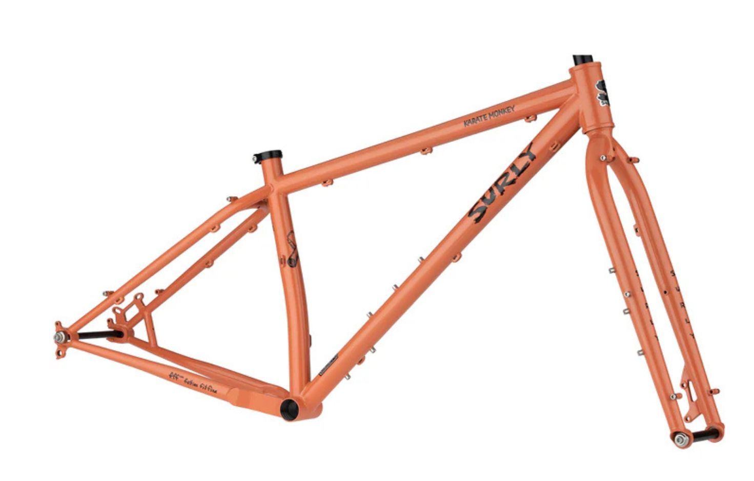 Πλαίσιο Surly Karate Monkey – 4130 Chromoly, σωληνώσεις Natch, διπλά ενισχυμένο (double-butted) κύριο τρίγωνο, σωλήνες με καμπύλωση τύπου τρομπέτας (trumpet flared), συγκολλημένο με TIG, με ηλεκτροστατική επίστρωση ED (Electrophoretic Deposition)
